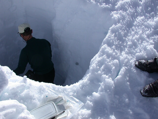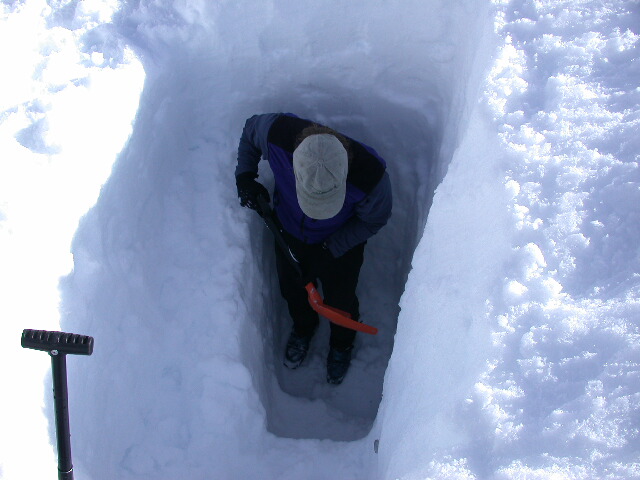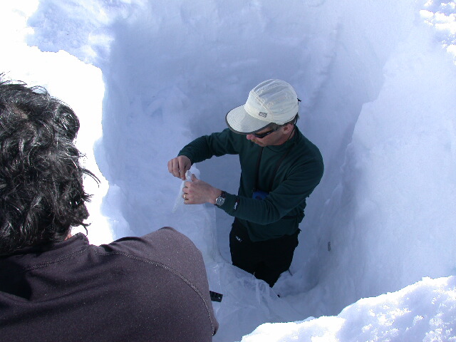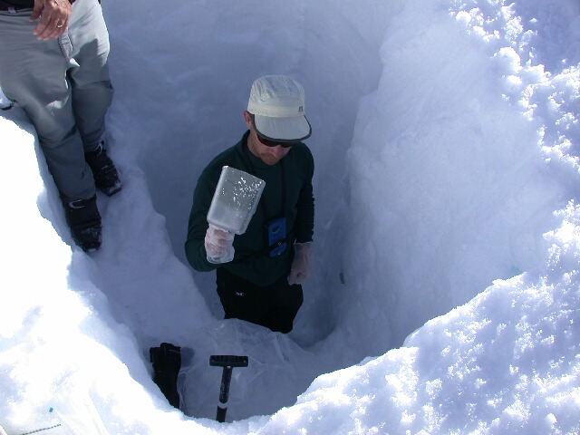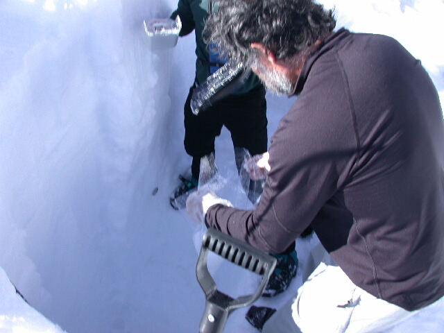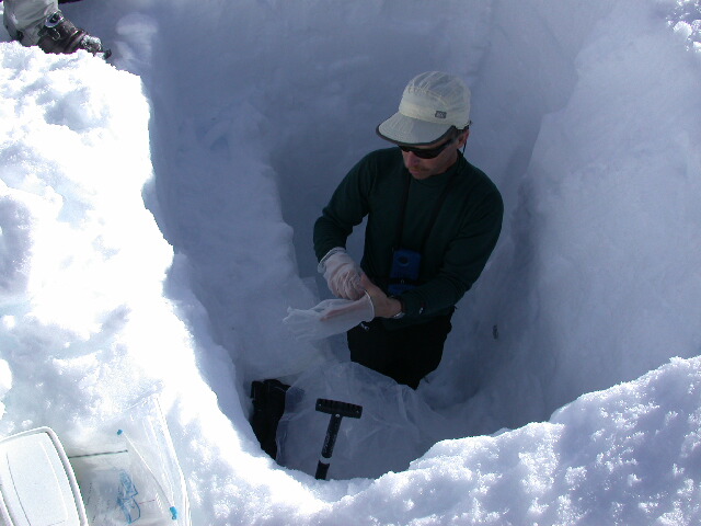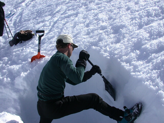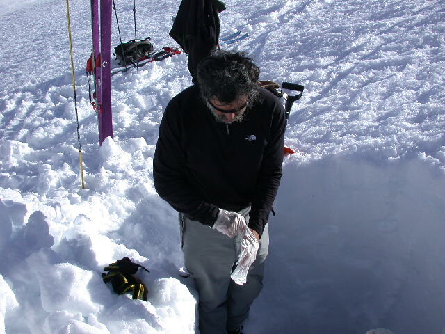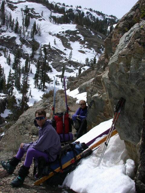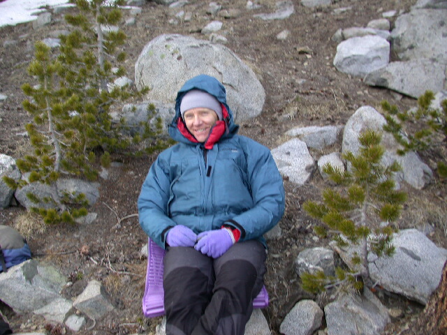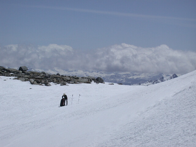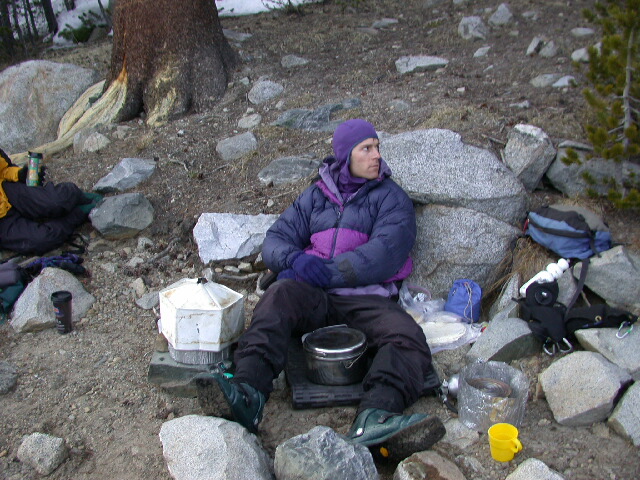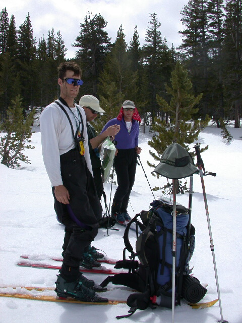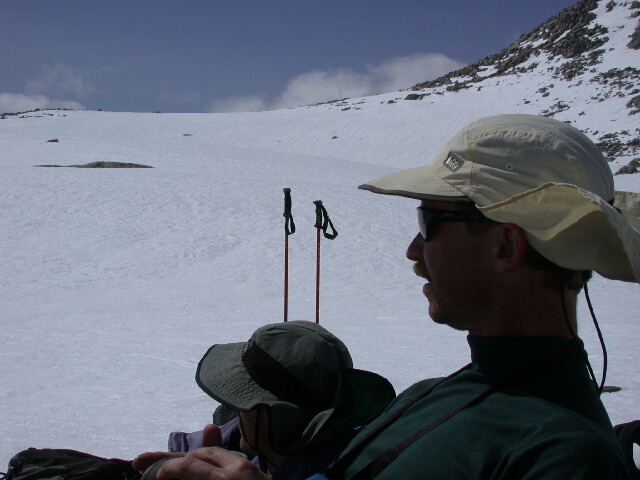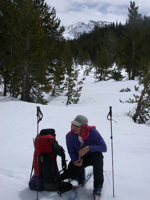 Mark Butler taking a rest while skiing down towards Dana Meadows.