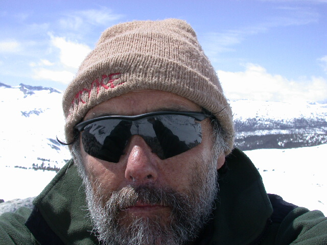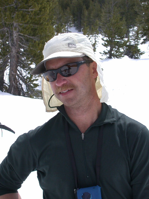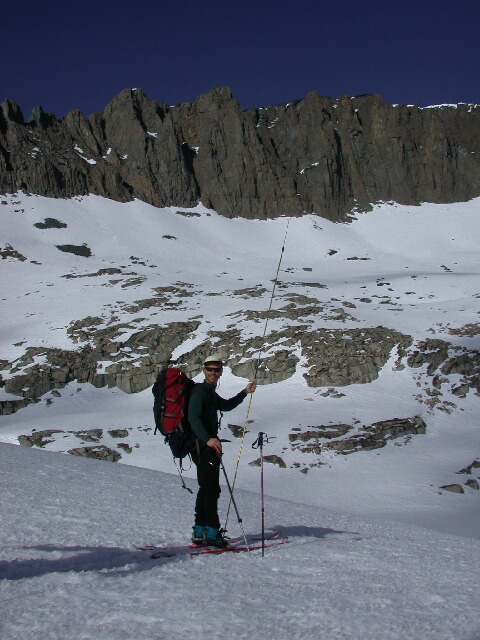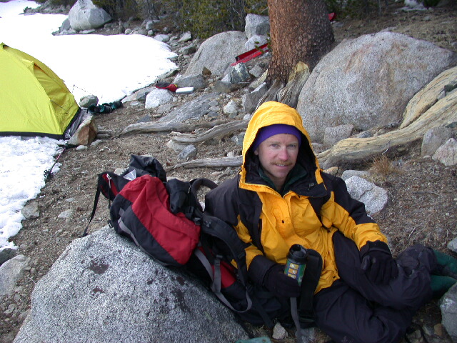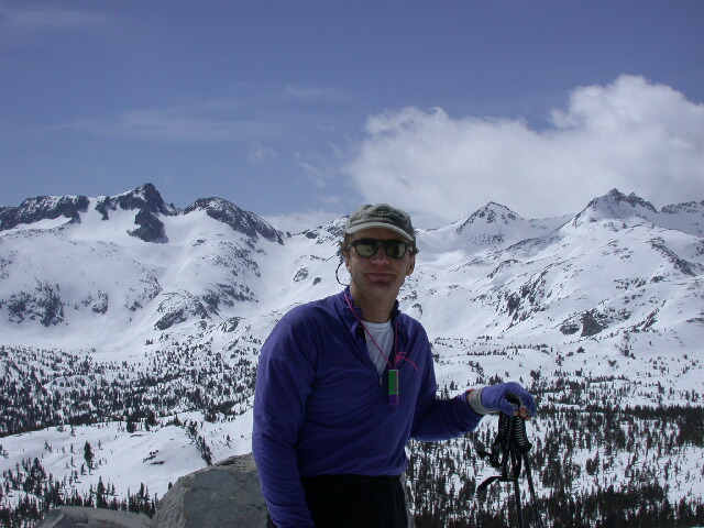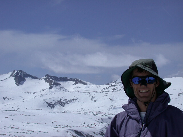 David Greenwood with Lyle Peak (?) behind him. Headwaters of the Tuolummne Drainage.