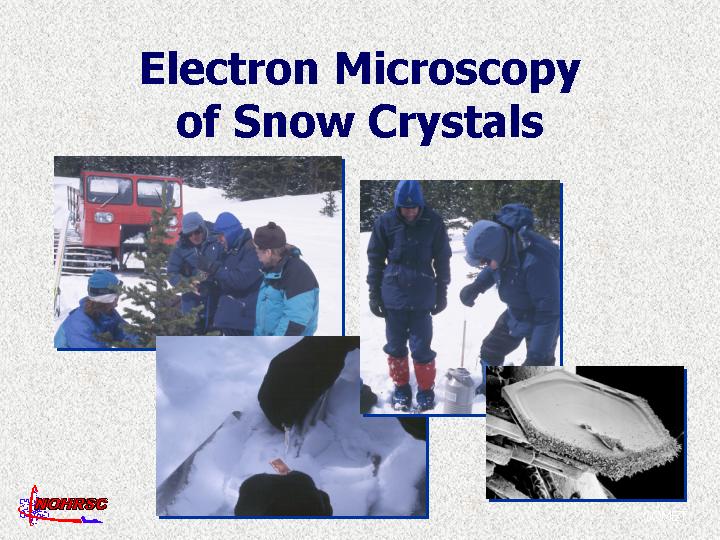 New improvements in scanning electron microscopy (SEM) have provided the ability to make the photos above. These photos are from a trip to Niwot Ridge to collect snow samples for SEM analysis by the SEM team headed by Bill Wergin.