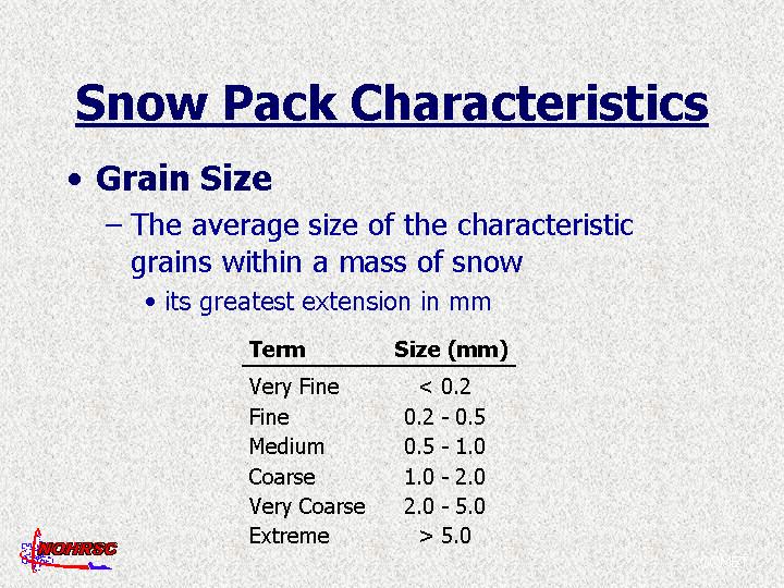 The type and size of individual grains within the snowpack influences a variety of processes, including the amount and strength of bonding within the snowpack and the rate and location of meltwater flow through snow. The growth rate and grain type within a dry snowpack is driven primarily by gradients of water vapor within the snowpack. In turn, vapor pressure gradients depend on four important variables: (1) initial type of ice particle and the conditions under which it was deposited in the snowpack, (2) the temperature of the snowpack, (3) the magnitude of any temperature gradient, and (4) the size of pore spaces. Grain size and type are estimated through use of a crystal card with a millimeter grid and an 8-10x hand lens.
