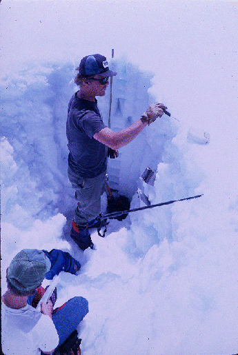 The best way to understand and measure snowpack properties is to dig a snowpit. A snowpit is constructed by digging a hole from the snow surface to the ground. The size of the hole is determined by (a) the number and (b) type of measurements you will make, as well as (c) the number of power bars you've consumed. Digging snow pits is hard work!