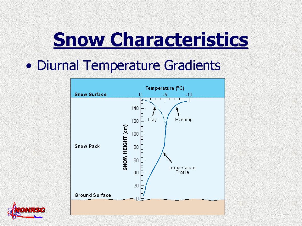 The temperature of the snowpack is an important variable for a variety of reasons. Temperatures within a snowpack are generally not uniform from top to bottom, which leads to gradients in the movement of water vapor through the snowpack. We'd like to know when the snowpack becomes isothermal at 0ºC and meltwater is released from the bottom of the snowpack to the hydrologic system. Snowpacks are bounded by the atmosphere above and in seasonally snow-covered areas by ground below. In general, the basal layer at the bottom of the snowpack is warmed to near 0ºC because of: (1) stored head in the ground from summer warming (most important), and (2) geothermal heat from the interior of the earth. The temperature of the snow surface responds to prevailing synoptic conditions as well as daytime heating and nighttime cooling (diurnal fluctuations). The combination of these boundary conditions usually results in a snow surface that is cooler than the bottom of the snowpack, producing a vertical gradient in temperature. The temperature of the snowpack can be measured using thermometers, thermisters, and thermocouples.