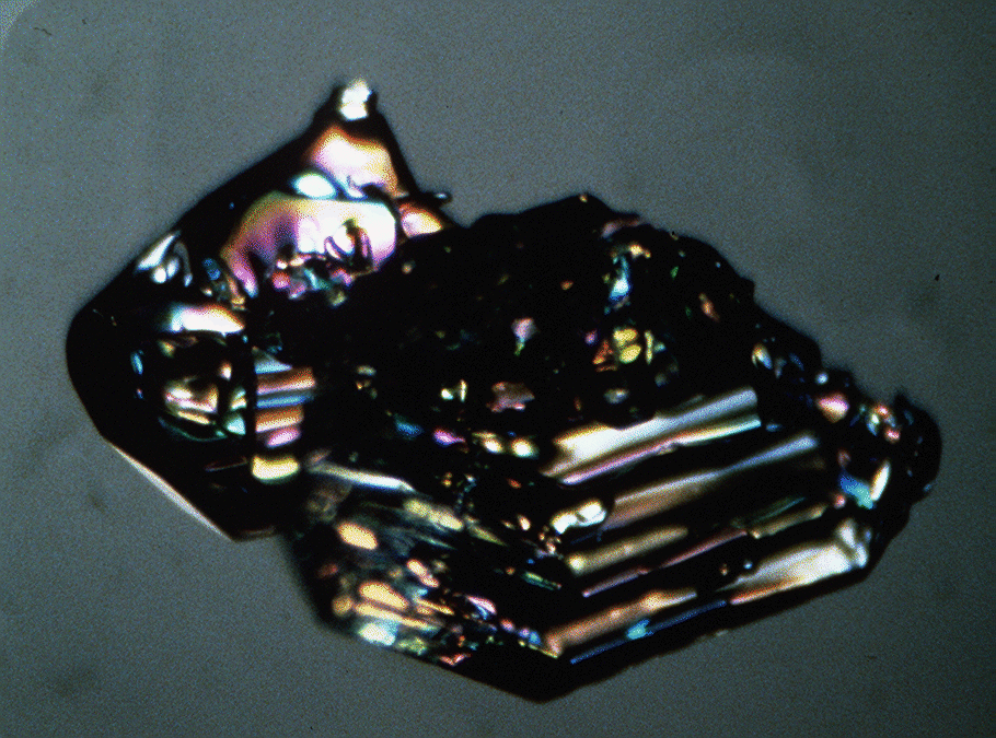 Two depth hoar crystals, photographed using polarized light. The width of the image is approximately 5 cm. Note that each crystal is pointed towards the top of the image and widest towards the bottom of the image. Water vapor is moving upwards, from the bottom of the image towards the top of the image. Hence the depth hoar crystals are growing downwards and INTO the source of water vapor. As each wave of water vapor condenses on the depth hoar crystal, the crystal becomes larger. The result is a very unstable crystal that acts like a lever.