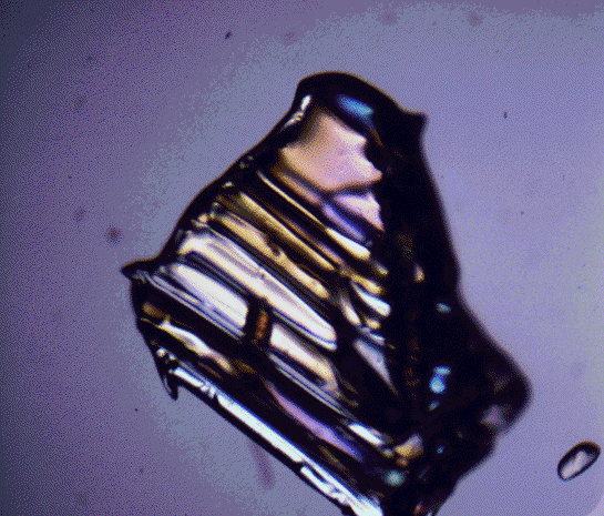 A depth hoar crystal, photographed using polarized light. Each different color is a different facet within the depth hoar crystal. Each facet represents a wave of water vapor that depositied as a single unit onto the existing crystal.
